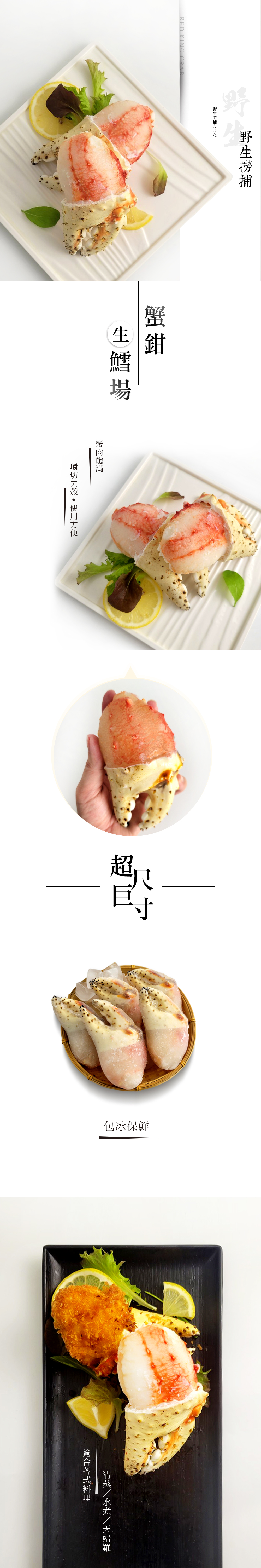 ◎最高等級紅蟹品種タラバガニ,已環切去殼, 解凍即可直接烹調, 料理食用最方便。