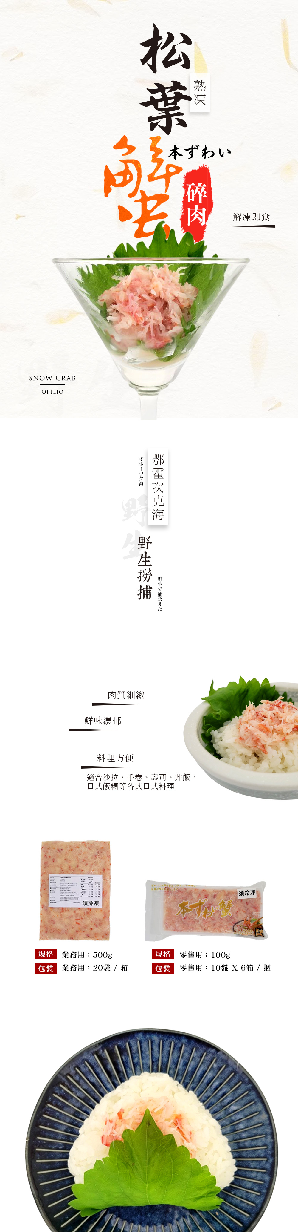 ◎真正取自松葉蟹身體的碎肉, 非一般市售魚漿煉製品!